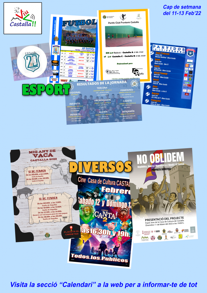 Publicado el 11 febrero, 202211 febrero, 2022 por ViuCastalla11-02-22: Noves activitats publicades d’ESPORT i DIVERSOS Publicades noves activitats per al cap de setmana a la secció “Calendari” de la web. Entra i informa’t de tot!!