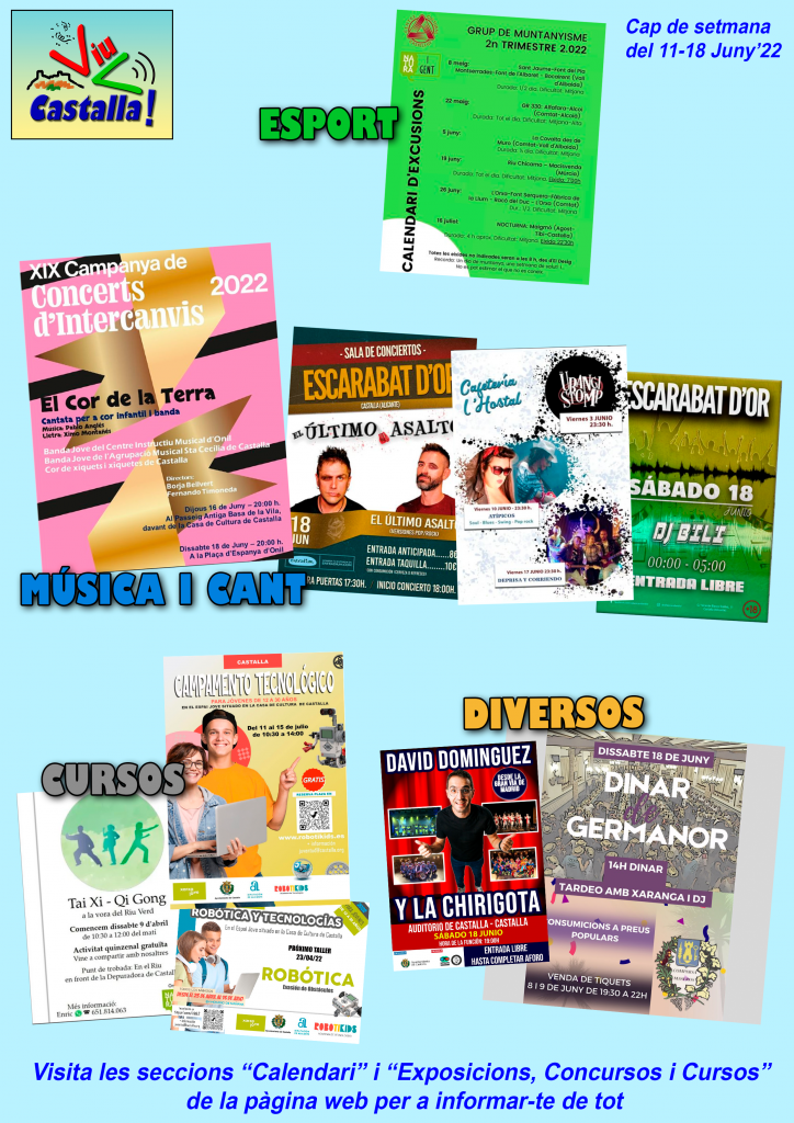 Publicado el 16 junio, 202216 junio, 2022 por ViuCastalla16-06-22: Noves activitats publicades d’ESPORT, MÚSICA, CANT, FESTA, DIVERSOS i CURSOS Publicades noves activitats per a les pròximes setmanes a les seccions «Calendari» y «Exposicions, Concursos i Cursos» de la web. Entra i informa’t de tot!