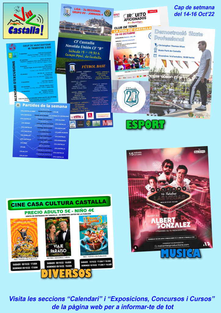 Publicado el 14 octubre, 202221 octubre, 2022 por ViuCastalla14-10-22: Noves activitats publicades d’ESPORT, MÚSICA i DIVERSOS Publicades noves activitats per a les pròximes setmanes a les seccions «Calendari» de la web. Entra i informa’t de tot!